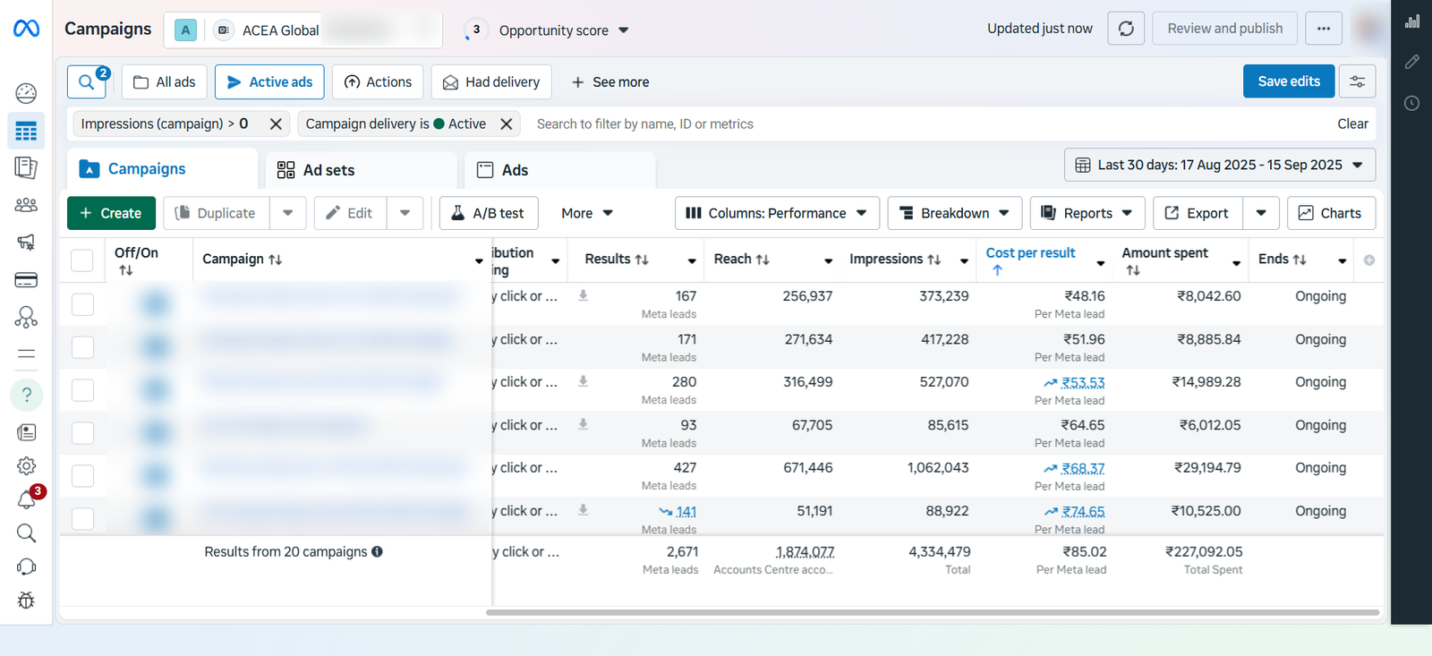 Before running optimized campaigns, ACEA Global struggled with generating a steady flow of qualified leads for both IELTS coaching and study abroad services. The objective was to scale student inquiries, maintain a low CPL, and increase brand awareness in Tier 1 & Tier 2 cities.